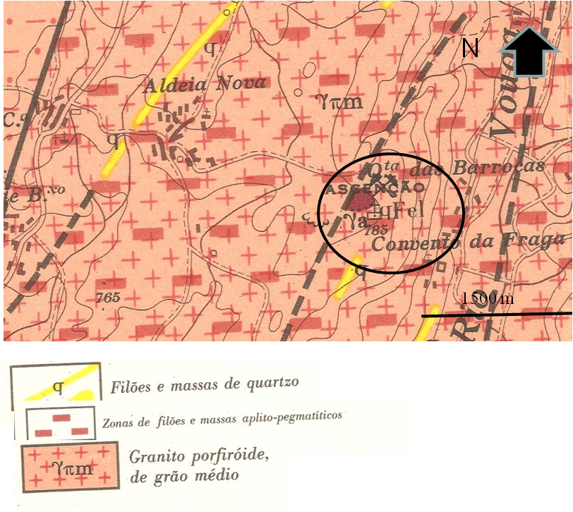 Geologicamente encontra-se localizada sobre uma massa de aplito-pegmatito, tendo como rocha encaixante um granito porfiróide de grão médio (fig.1)