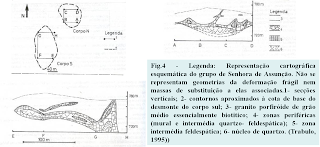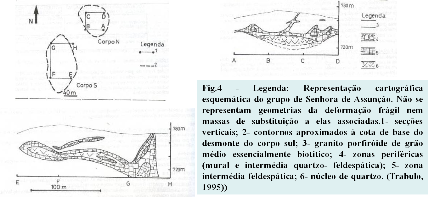Os pegmatitos do grupo da Senhora da Assunção apresentam-se expostos em dois desmontes que distam entre si cerca de 50 m (fig.4) A disposição dos dois corpos segundo um eixo de orientação N25ºE, é concordante com as trajectórias de fluidalidade, no sector, e compatível com a distribuição global arqueada dos pegmatitos intra-granitícos. Os corpos pegmatiticos têm uma disposição em haltere achatado sub-horizontal, possuindo 100 m de comprimento (Trabulo, 1995)